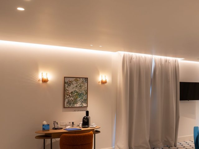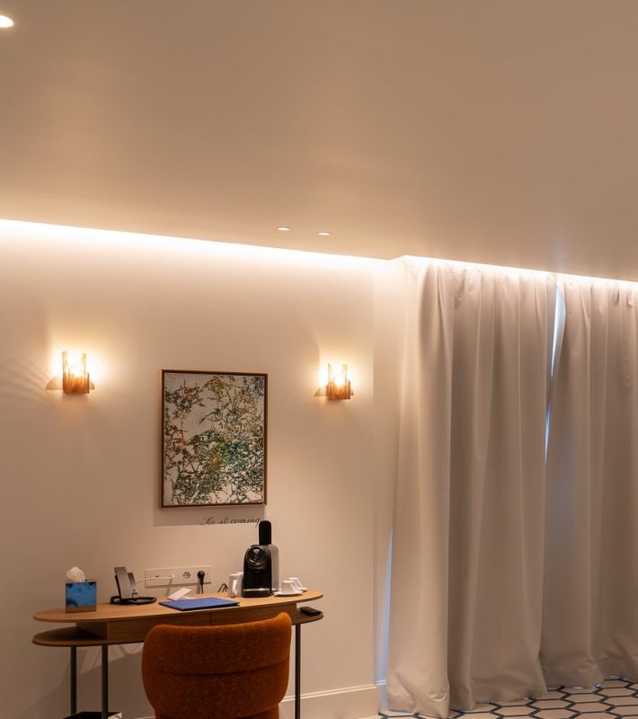 Au cœur du hall, une suspension en forme de nuage flotte délicatement dans l’espace, apportant une touche onirique et aérienne dès l’entrée. Dans les différentes pièces de l’hôtel, nos appliques murales viennent ponctuer les ambiances, apportant une lumière subtile, chaleureuse et toujours au service du décor.